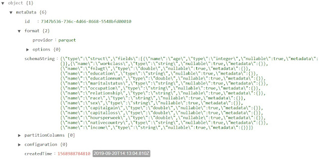 As expected, the "schemaString" attribute has a ton of information about each field, stored in an array named "fields".